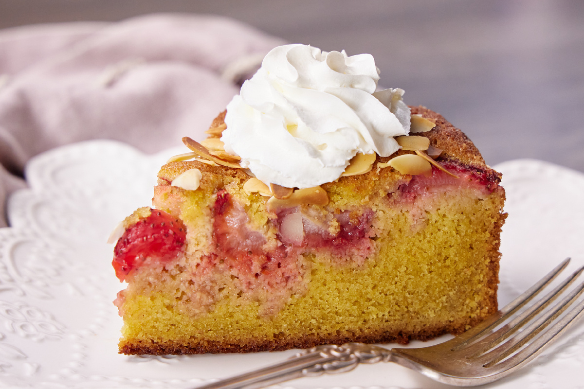 Кукурузный пирог с клубникой! Ингредиенты: - Клубника — 500 г - Кукурузная мука — 420 г - Сливочное масло — 320 г - Сахар — 300 г - Яйца — 8 шт. - Лимон — цедра 1 шт. и сок 1/4 шт. - Сода — 1 ч. л. - Соль — щепотка - Миндальные лепестки — 30 г - Взбитые сливки — для подачи Приготовление: 1. В миске взбейте 300 г мягкого сливочного масла с щепоткой соли и сахаром до однородности и посветления. По одному введите яйца, каждый раз тщательно взбивая. 2. Добавьте 400 г кукурузной муки и 1 ч. л. соды, перемешайте до однородного теста. Натёртую на мелкой тёрке цедру лимона и сок четверти лимона вмешайте в тесто. 3. У клубники удалите хвостики, ягоды разрежьте пополам. Форму застелите пергаментом, смажьте 20 г масла, посыпьте 20 г кукурузной муки. Выложите тесто, разровняйте, сверху распределите клубнику. 4. Выпекайте при 180°C примерно 35 минут. За 10 минут до готовности посыпьте пирог миндальными лепестками, доведите до золотистой корочки. 5. Готовый пирог слегка остудите, уберите борта форм