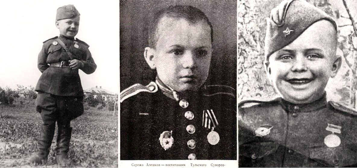 Шестилетний гвардеец Сергей Алёшков-Алёшкин Дети войны. Сколько их маленьких героев, известных и неизвестных, прошло через жернова войны... Самым юным солдатом Великой Отечественной Войны был шестилетний гвардии рядовой Серёжа Алёшков, воспитанник 142-го гвардейского стрелкового полка 47-й гвардейской стрелковой дивизии. Родился Серёжа 31 января 1936 года в лесной деревне Грынь Калужской области. Его отец умер ещё до войны, оставив сиротами четверых детей. Серёжа был самым младшим. В начале войны два старших брата Алёшковых ушли на фронт. Осенью 1941 года Калужская область была занята гитлеровцами и деревня, где жили Алёшковы, стала базой партизанского отряда, а её жители – партизанами. В их числе были и мать Серёжи с его старшим братом десяти лет Петей. На одном из заданий они были схвачены гитлеровцами. После пыток мать и брата казнили: Петя был повешен, а пытавшаяся спасти сына мать застрелена гестаповцем. Когда Серёжа подбежал к срезанной автоматной очередью матери, один из карат