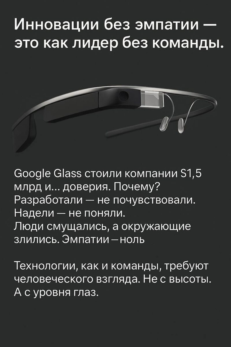 Продолжая тему лидерства, да еще и технологичного, хочется посмотреть на большие компании и поделиться с вами их уроками. 👓 Google Glass — $1.5 млрд в урну. Не из-за технологий. А из-за отсутствия эмпатии. Разработчики увидели в них революцию. Люди — странные очки, за которые стыдно в метро. ❌ Нет сценариев. ❌ Нет заботы о восприятии. ❌ Нет чувства, что это «для меня». Когда Google начал слушать, а не доказывать — очки ожили. Но уже в B2B: там, где процессы, а не эмоции. Мораль: быть «технологичным лидером» — мало. Надо быть человеком. Бывает у вас перекос в процессы, а не человечность? Или может наблюдали в других бизнесах?