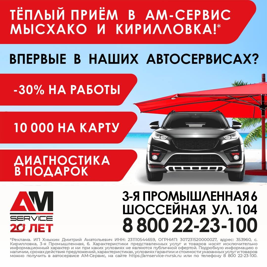 Тёплый приём теперь и в АМ-Сервис Кирилловка! 😎☀️🚘🌴 Для впервые посетивших наши автосервисы в Кирилловке и Мысхако автовладельцев действует специальное предложение! 1. 30 % скидка на работы 2. 10 000 руб. и до 10% кешбэк на бонусную карту 3. Бесплатный осмотр по следующим позициям: • осмотр тормозной системы • осмотр подвески и рулевого управления • осмотр трансмиссии • проверка герметичности узлов и агрегатов • проверка технических жидкостей • проверка световых приборов • проверка аккумулятора Оцените комфорт и качество обслуживания «АМ-Сервис»! Предложение действительно с 01.08.25 до 30.09.25. Новороссийск СТО Кирилловка, 3-я Промышленная, 6 СТО Мысхако, Шоссейная, 104