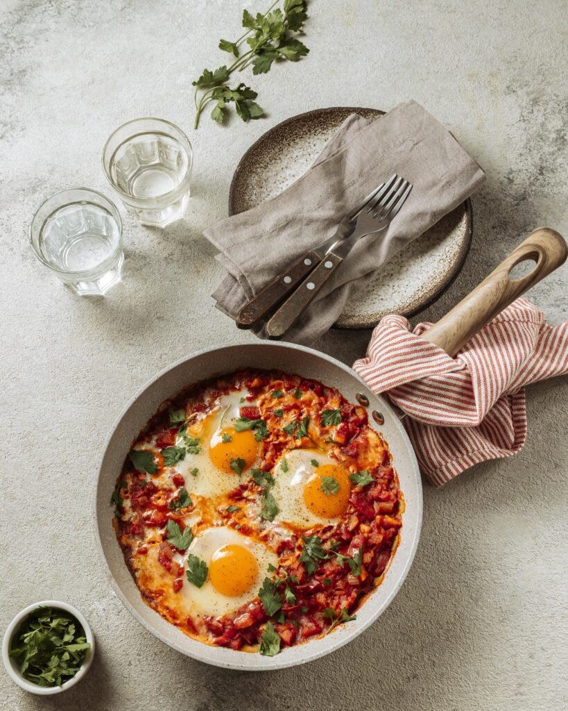 Шакшука: любимое блюдо для завтрака многих! Яркий томатный соус с обжаренными овощами и согревающими специями (кумин, паприка, кориандр) уваривается до густоты, а затем в нем аккуратно готовятся яйца – до идеальной консистенции по вашему вкусу.