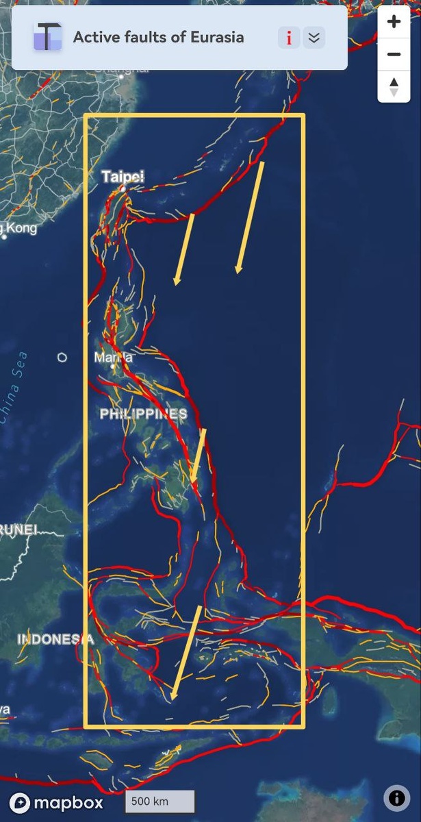 Выглядит так, словно вся западная граница Филиппинской плиты уехала на юго-запад (по типу провала