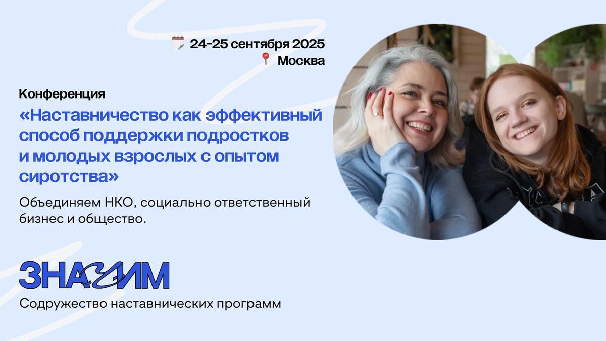 24-25 сентября состоится Конференция «Наставничество как эффективный способ поддержки подростков и молодых взрослых с опытом сиротства. Объединяем НКО, социально ответственный бизнес и общество». Мы знаем, что наставничество — один из самых действенных способов поддержки подростков и молодых взрослым с опытом сиротства. И мы знаем, как много трудностей возникает у всех, кто разрабатывает, внедряет, реализует и масштабирует наставнические программы. Нужно объединять существующие экспертизу и опыт, а также ресурсы НКО, бизнеса и общества, чтобы такой формат поддержки стал доступным в каждом регионе страны.