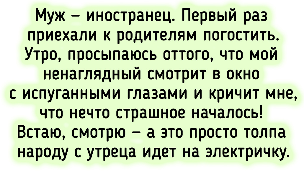 Муж — иностранец. Первый раз приехали к родителям погостить. Утро, просыпаюсь оттого, что мой ненаглядный смотрит в окно с испуганными глазами и кричит мне, что нечто страшное началось! Встаю, смотрю — а это просто толпа народу с утреца идет на электричку. © Подслушано