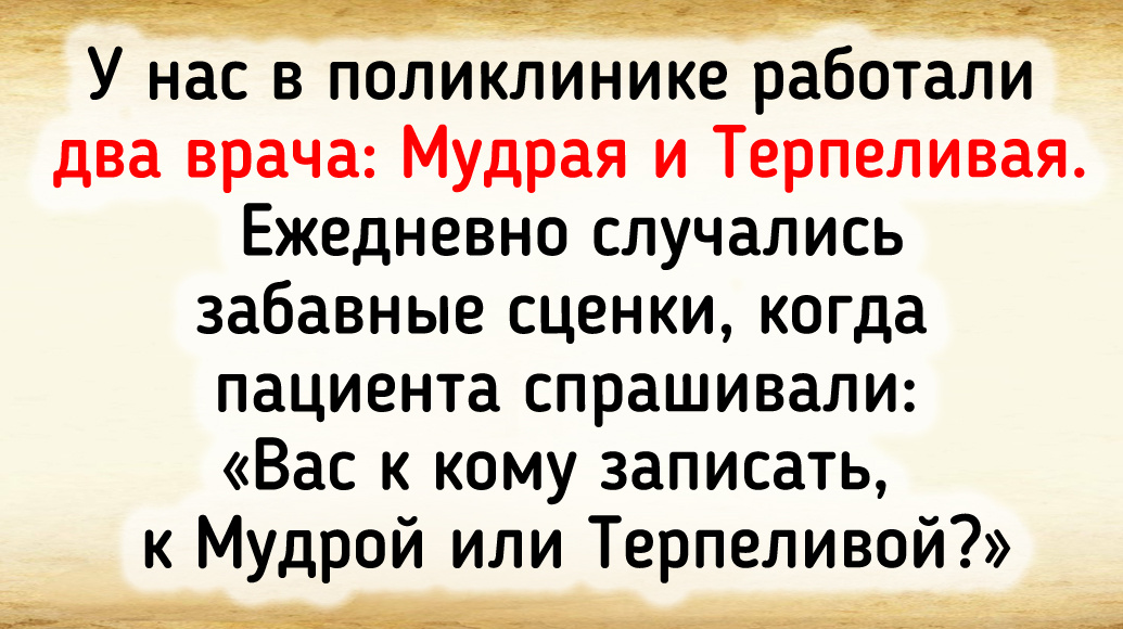 У нас в поликлинике работали два врача: Мудрая и Терпеливая. Ежедневно случались забавные сценки, когда пациента спрашивали: «Вас к кому записать, к Мудрой или Терпеливой?» © Эльфи.Ника