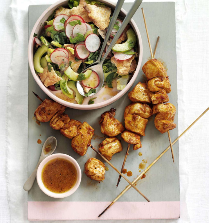 Время приготовления — 25 минут. 2 порции. Уровень сложности — лёгкий. Фаттуш — это деревенский ближневосточный салат, приготовленный из хлеба и сезонных овощей. Ингредиенты: - 1 разрезанная пополам пита - 2 куриные грудки без кожи, нарезанные на кусочки - 1 столовая ложка соуса харисса - оливковое масло - сок половины лимона - 1 измельчённый зубчик чеснока - 100 граммов нарезанного редиса - половина очищенного и нарезанного огурца - 1 пучок грубо нарезанного салата - 2 веточки мелко нарезанного зелёного лука - горсть грубо нарезанной мяты Поджарьте половинки питы до золотистого цвета и хрустящей корочки. Разломите их на крупные куски и отложите в сторону. Смешайте кусочки куриного филе с соусом харисса, 2 чайными ложками оливкового масла и приправьте. Нанизайте их на шампуры и жарьте на гриле, часто переворачивая, до полной готовности. Приготовление фаттуша: смешайте 1 столовую ложку оливкового масла с лимонным соком, чесноком, редисом, огурцом, салатом, луком и мятой. Добавьте хлеб и