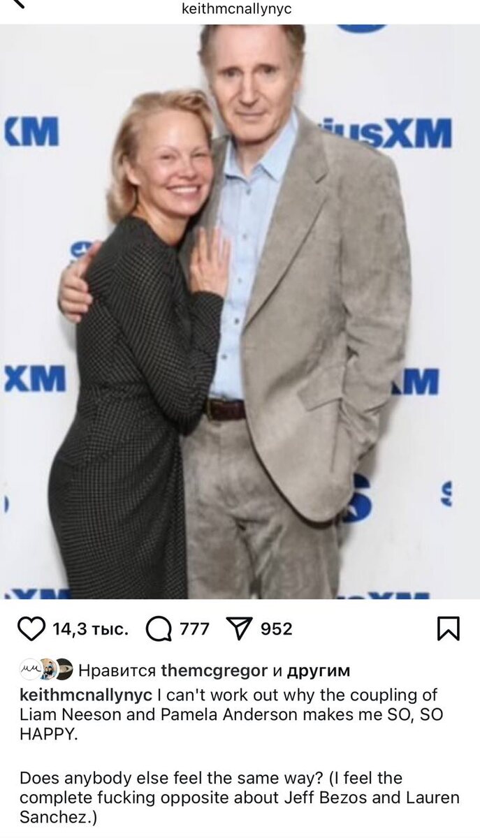 О предполагаемом романе Памелы Андерсон и Лиама Нисона админ узнал сегодня из запретграма Кита МакНэлли