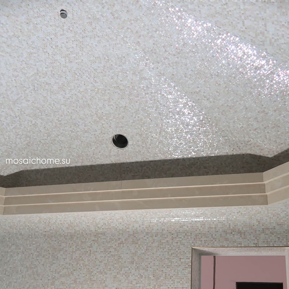 Белые, бежевые и розовые матовые и перламутровые оттенки мозаики идеально подходят для оформления стен и купола хамама.