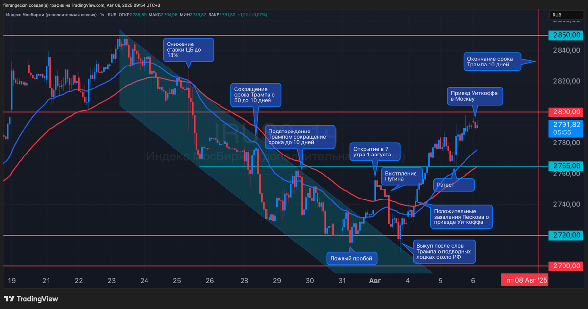 Здесь думаю нет смысла гадать, скоро всё узнаем. Сегодня утром в Москву прилетел Уиткофф для переговоров. Тем временем индекс МосБиржи несмотря на сильные проливы подошёл к важном уровню сопротивления – 2800 пунктов.