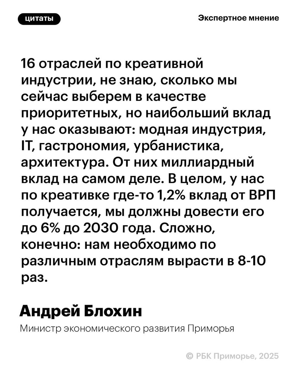 Власти Приморья определят приоритетные отрасли в сфере креативных индустрий, чтобы разработать программы их развития Об этом в интервью РБК Приморье рассказал глава краевого минэкономразвития Андрей Блохин. Эта работа будет проводиться в рамках нового закона о поддержке креативных индустрий, единогласно принятого депутатами ЗС ПК в конце июля. 🔹Блохин отметил, что всего отраслей креативных индустрий 16. Наибольший вклад в экономику края оказывают модная индустрия, IT, гастрономия, урбанистика и архитектура. Какие именно станут приоритетными пока говорить рано. 😃Подписывайтесь на РБК Восток