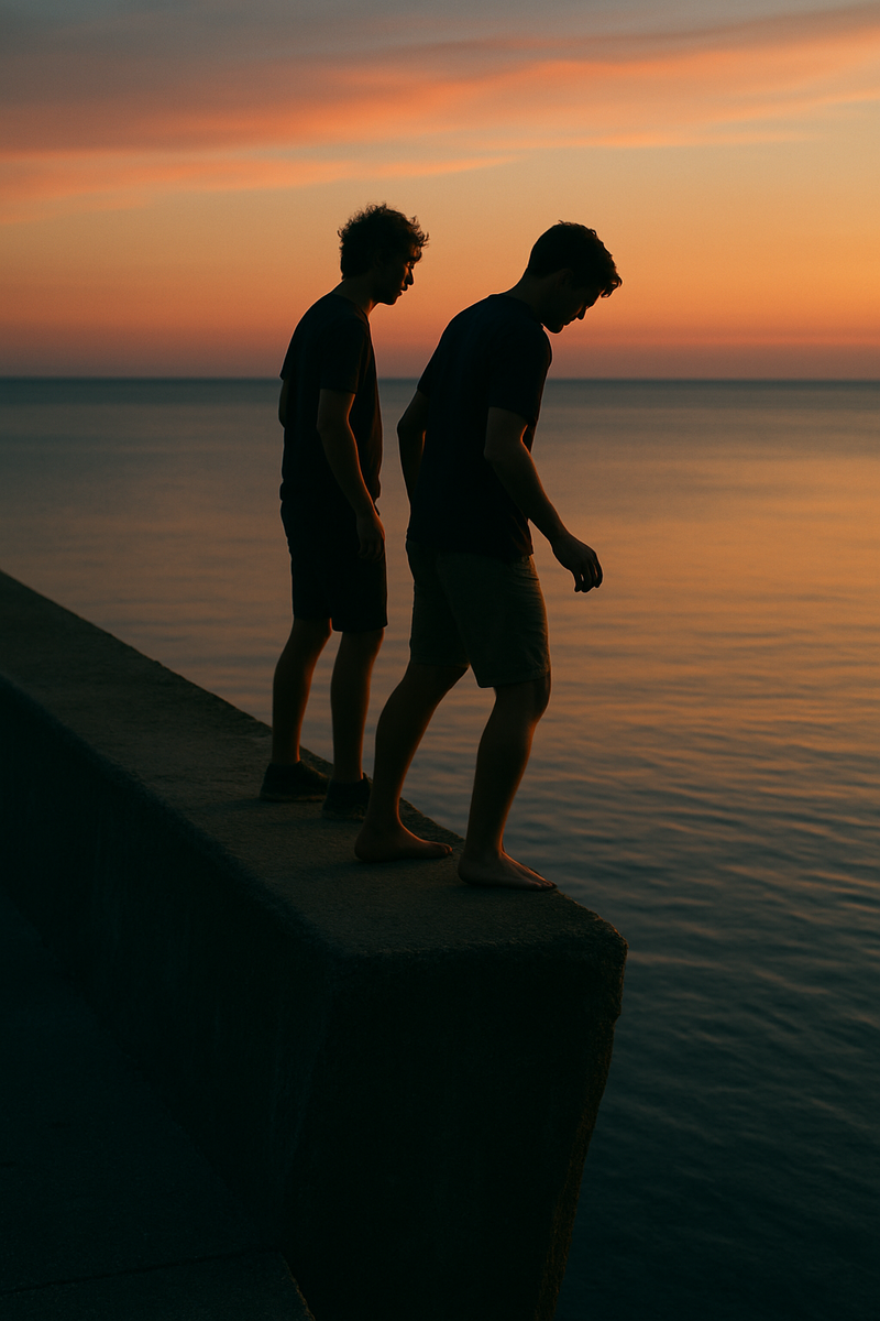 Когда-то мы с Никитой ещё могли ехать куда угодно. Без плана, без цели, без людей, которые ждут нас к ужину. Мы могли позволить себе роскошь потеряться. В один из таких дней мы оказались на Капчагайском водохранилище. Это место уже впитало в себя десятки наших историй: бетонный колодец, полуразрушенные насосные станции, девчонки с бутылками и огонь, который горит даже на воде. А тогда был ветер. И волнение. Мы стояли у края волнореза — таких бетонных блоков, выстроенных в цепь, чтобы гасить удары воды у бухты. Высота? Метра 18, может, больше. Снизу — мутная вода, чёрная как нефть. И никому не известно, что под ней — арматура, блоки, пустота, острые углы. Местные пацаны прыгают. Кто сальто, кто просто ласточкой — головой вперёд. Кто-то — со своей GoPro. Кто-то — навсегда. И мы с Никитой стоим, смотрим. Шутим: — Прыгнем? — А чё, может, прыгнем? И вдруг — всё становится серьёзно. Я смотрю вниз — и во мне закипает что-то древнее, как будто всё тело кричит: «Сделай шаг. Проверь, жив