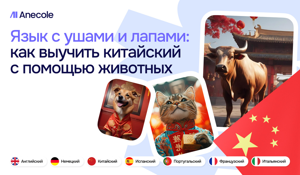 Автор: Ирина Адаменко, учитель китайского языка в школе Anecole Китайский язык часто воспринимают как загадку: тоны, тысячи иероглифов, сложная система письма... Кажется, что это путь только для самых смелых и терпеливых. Но что, если взглянуть на китайский по-другому — не как на лингвистическую крепость, а как на систему, где все строится на логике и образах? Представьте, что вы складываете простые части, как конструктор, и получаете слова: «слон» — это «длинноносое животное», «панда» — «медведь-кошка». В китайском действительно нет артиклей, склонений и спряжений. Все четко и по делу. Сегодня покажем вам, как устроен китайский язык — через мир животных. Потому что начать изучение китайского проще всего... с хвоста и усов. Животное и его название Для примера возьмем названия животных и слова, связанные с ними. Начнем с того, что названия многих животных в китайском языке созвучны звукам, которые они издают. В отличие от русского, где «мяу» и «кошка» фонетически не связаны, китайский ч