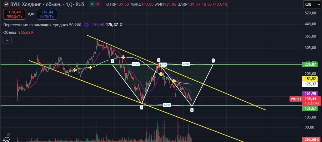 #WUSH 🕯На графике похоже цена строит разворотную фигуру. Пока что говорить точно, что это двойное дно рано, но предпосылки к его построению есть. Поддержка 126,57, куда может дойти. 🔽Если пробьет - увидим понижение цены до 93 руб. 🔼Если оттолкнёт, то скорее всего пойдёт строить двойное дно – фигуру, сигнализирующая нам, повышение цены. ✔️Сопротивлением 156, далее 177,7 - при пробить этих уровней увидим движение цены до 236,9. НЕ ИИР #теханализ #трейдер #вуш
