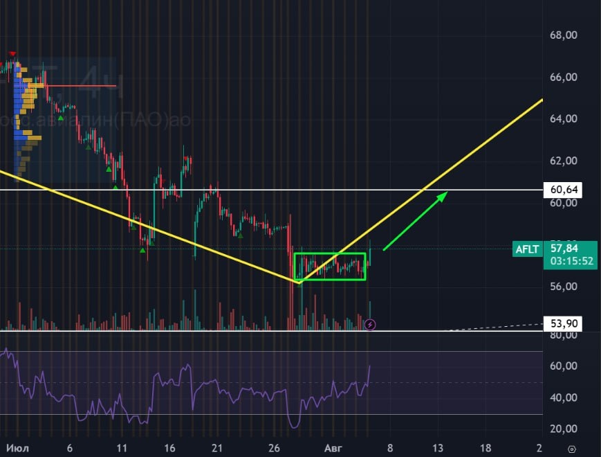 ✈️ #AFLT #Аэрофлот #bogdanoffinvest 🟢 Сегодня утром на видео смотрел Аэрофлот, а уже утром есть выход вверх их накопления. 🟢 Жду в целом рост рынка. цели у Аэрофлота 60,64 или 66,70. 🚗 Считаю, что все это движение будет эйфоричным отскоком, хоть и высоким, после чего движение по рынку продолжится вниз.