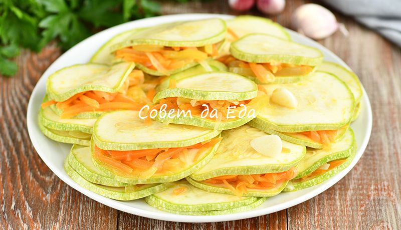 9. Маринованные кабачки перекладываем на тарелку и наслаждаемся вкусом. Обжаренные овощи дают кабачкам интересный вкус. Чуть хрустящие овощи внутри, хрустящий кабачок снаружи, приятная кислинка и острота от уксуса, вкус чеснока и зелени — это невероятно вкусно, а еще и красиво!