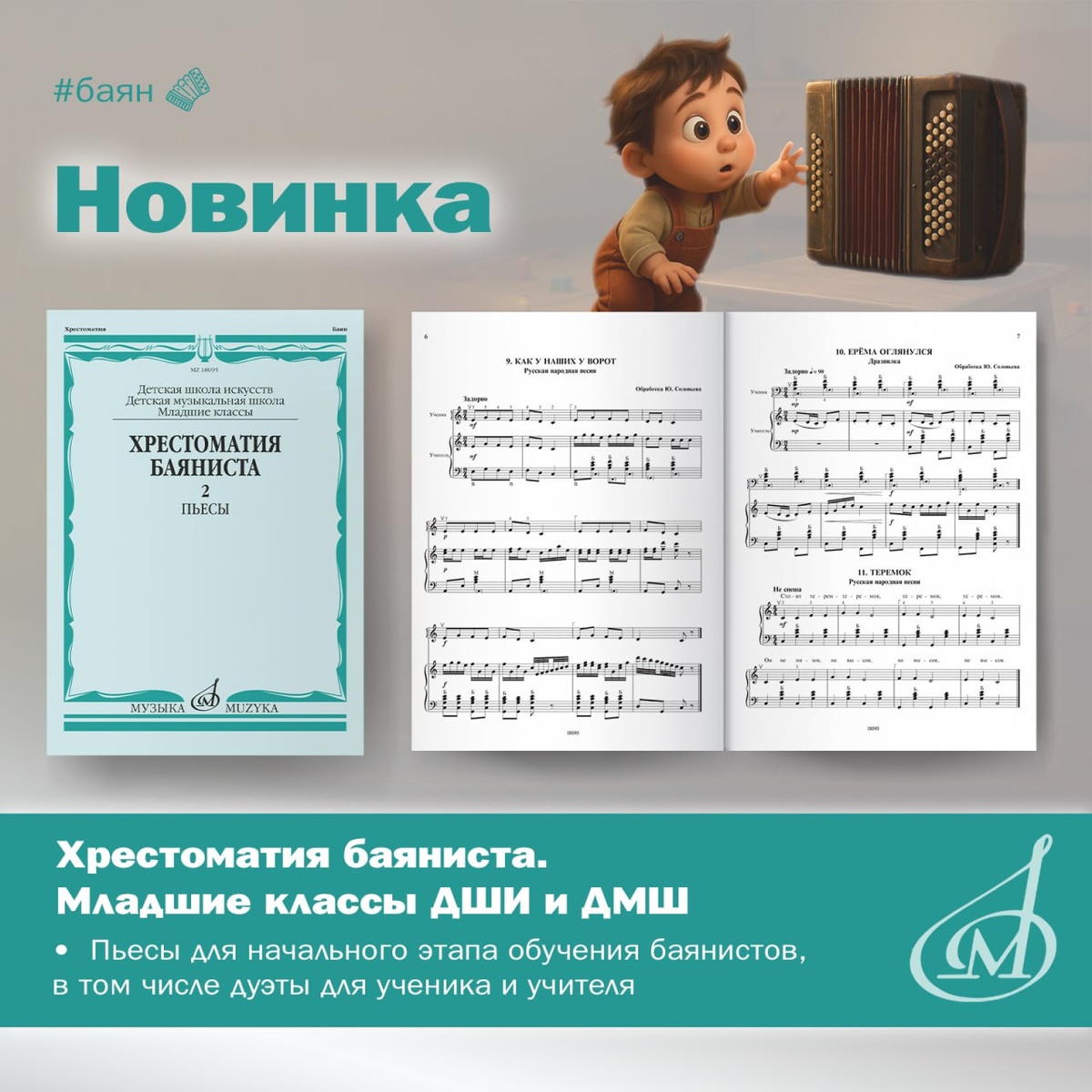 Новинка: Серия «Хрестоматия баяниста». Выпуск 2. Пьесы. Младшие классы ДШИ и ДМШ 🪗 Составитель А. Крылусов Самое время начать готовиться к новому учебному году! Вышел второй выпуск серии «Хрестоматии баяниста» для юных музыкантов. Рассказываем об издании подробнее. 🔵Репертуар для баяна очень широк. К празднованию Всероссийского дня баяна мы даже готовили для вас специальную подборку изданий «Музыки» для этого замечательного инструмента. Тем не менее педагогический репертуар постоянно требует пересмотра и актуализации. 🔵Настоящий выпуск хрестоматии предлагает более 100 пьес для начинающих музыкантов. Составитель позаботился о разнообразии материала, включив в сборник миниатюры разных жанров и пьесы на темы знаменитых народных мелодий. В частности, в сборнике можно найти танцевальные пьесы Баха, Гайдна, Бетховена, программные миниатюры русских и зарубежных авторов, обработки русских, армянских, грузинских, английских, французских мелодий и т. д. Кроме того, в сборник включены и нес