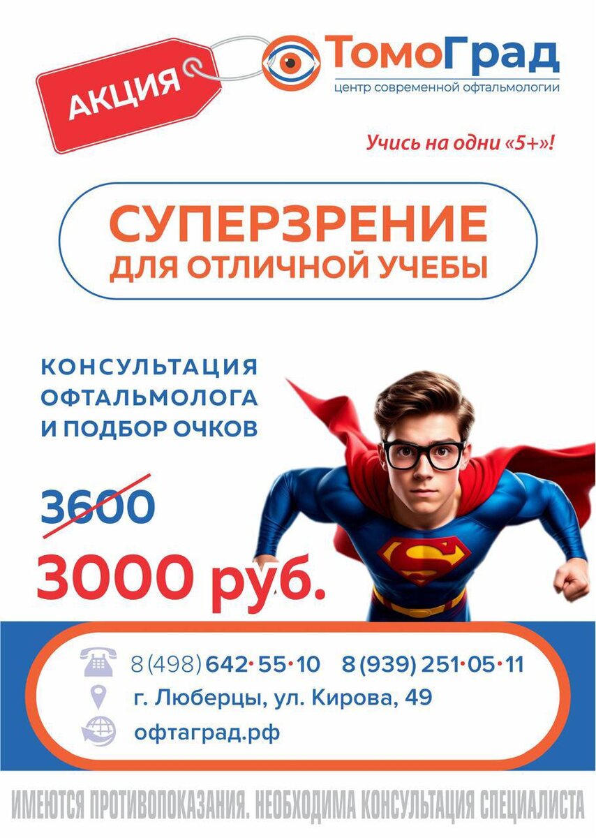 Супер🦸родители, Центр современной офтальмологии «Томоград» спешит на помощь!🛟 Наши супер🦸♂️детки часто не говорят о проблемах со зрением👀 и это сказывается на учебе и отметках😞 Придайте уверенности своему Супершкольнику🔔-приведите на осмотр к Суперофтальмологу👩⚕️ 💥Только в августе для вас-родители СУПЕРакция!💥 Ждём 🦸Супергероев и их Суперродителей по адресу: 📍город Люберцы, улица Кирова 49 📞8 (939) 251-05-11, 🤳https://t.me/Tomograd_Luber 🌐 https://zapis-v-online.ru/ServicesPrice.aspx?BusinessID=dcbcf2bc-6a5d-427e
