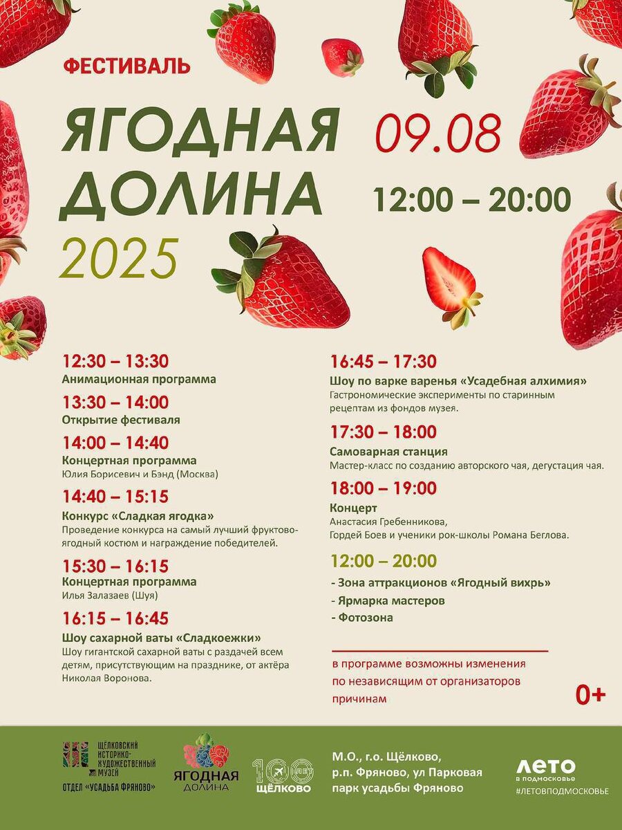 Фестиваль «Ягодная долина» в парке усадьбы Фряново! 🥰 Традиционный фестиваль пройдёт уже в эту субботу. Готовьте варенье из хорошего настроения и надевайте ягодные костюмы — будет по-летнему вкусно, весело и очень душевно ✨ Вас ждут: 🟡 зажигательный концерт с выступлениями артистов; 🟡 анимационная программа; 🟡 шоу сахарной ваты; 🟡 самоварная станция; 🟡 ярмарка мастеров; 🟡 открытие новой выставки; 🟡 шоу по варке варенья. 🍓 И, конечно, конкурс на самый лучший фруктово-ягодный костюм и награждение его победителей! 🗓 9 августа в 12:00. #культуращёлково #летовподмосковье