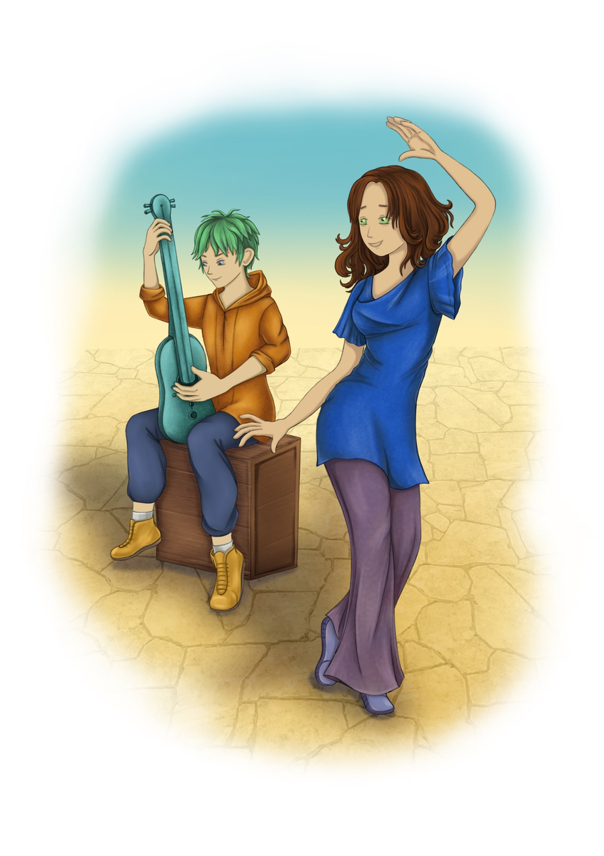 Вэйт приблизилась к неплотно стоящим рядам людей и попыталась заглянуть за спины. Посреди живого круга сидел на перевернутой деревянной коробке зеленоволосый парень, державший в руках странный инструмент. Визуально он был похож на гитару, но у него была всего одна струна, и инструмент он держал вертикально. Рядом с ним стояла девушка в широких расклешенных штанах и длинной синей тунике. Как и все люди с вьющимися волосами, она предпочитала свой натуральный каштановый оттенок. Девушка кивнула парню, и он начал пощипывать струну, сначала медленно, потом быстрее. Неизвестно откуда полилась ритмичная музыка, игравшаяся, кажется, на нескольких инструментах сразу. Толпа стояла и, кажется, чего-то ждала. Девушка кивнула и начала плавно двигаться, покачивая бедрами. Потом глубоко вздохнула встряхнула волосами, по толпе прокатился выдох.
