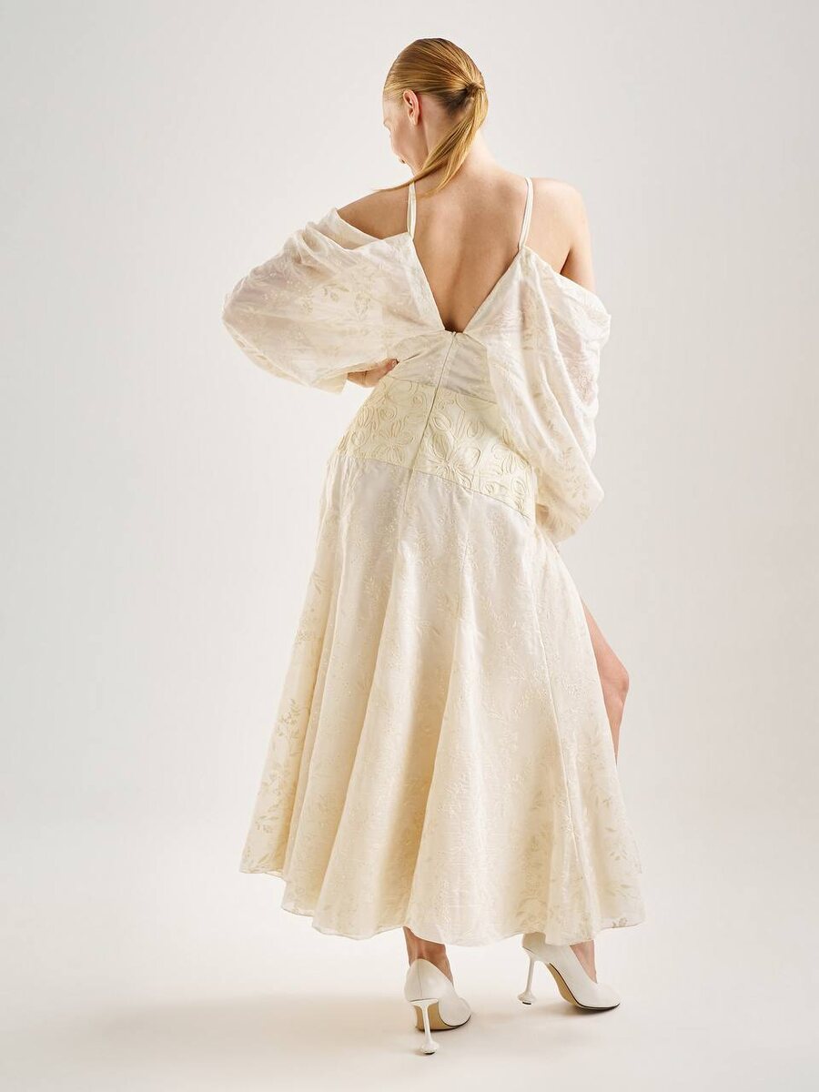 Платье в античном стиле (45000₽) сложного кроя с ниспадающими плечами из воздушной ткани с шитьем и нижнем слоем из натурального шелка — поистине произведение искусства! Это вечерний или свадебный образ, который украсит важный день и станет артефактом гардероба, который захочется передать по наследству