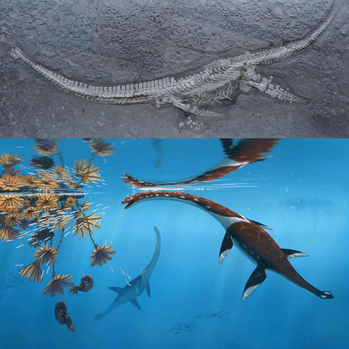 Немного свежих новостей науки Палеонтологи описали необычный новый род и вид раннедивергентного плезиозавра по почти полному скелету, найденному в нижнеюрских сланцах Позидония в Хольцмадене, Германия. Новый вид, плезионект (Plesionectes longicollum), обитал в раннеюрских морях около 183 миллионов лет назад.Длина морской рептилии составляла около 3,2 м, длина шеи — 1,25 м, а длина хвоста — 81 см. Скелет этого животного с остатками окаменелых мягких тканей был первоначально найден в 1978 году в карьере в сланцах Позидония в Хольцмадене, Германия, но его уникальные анатомические особенности были полностью изучены только сейчас благодаря комплексному научному анализу. «Этот экземпляр хранится в коллекциях уже несколько десятилетий, но предыдущие исследования так и не смогли в полной мере изучить его отличительные анатомические особенности», — говорит доктор Свен Сакс, палеонтолог из Музея естествознания Билефельда. «Наше детальное исследование выявило необычное сочетание особенностей скел