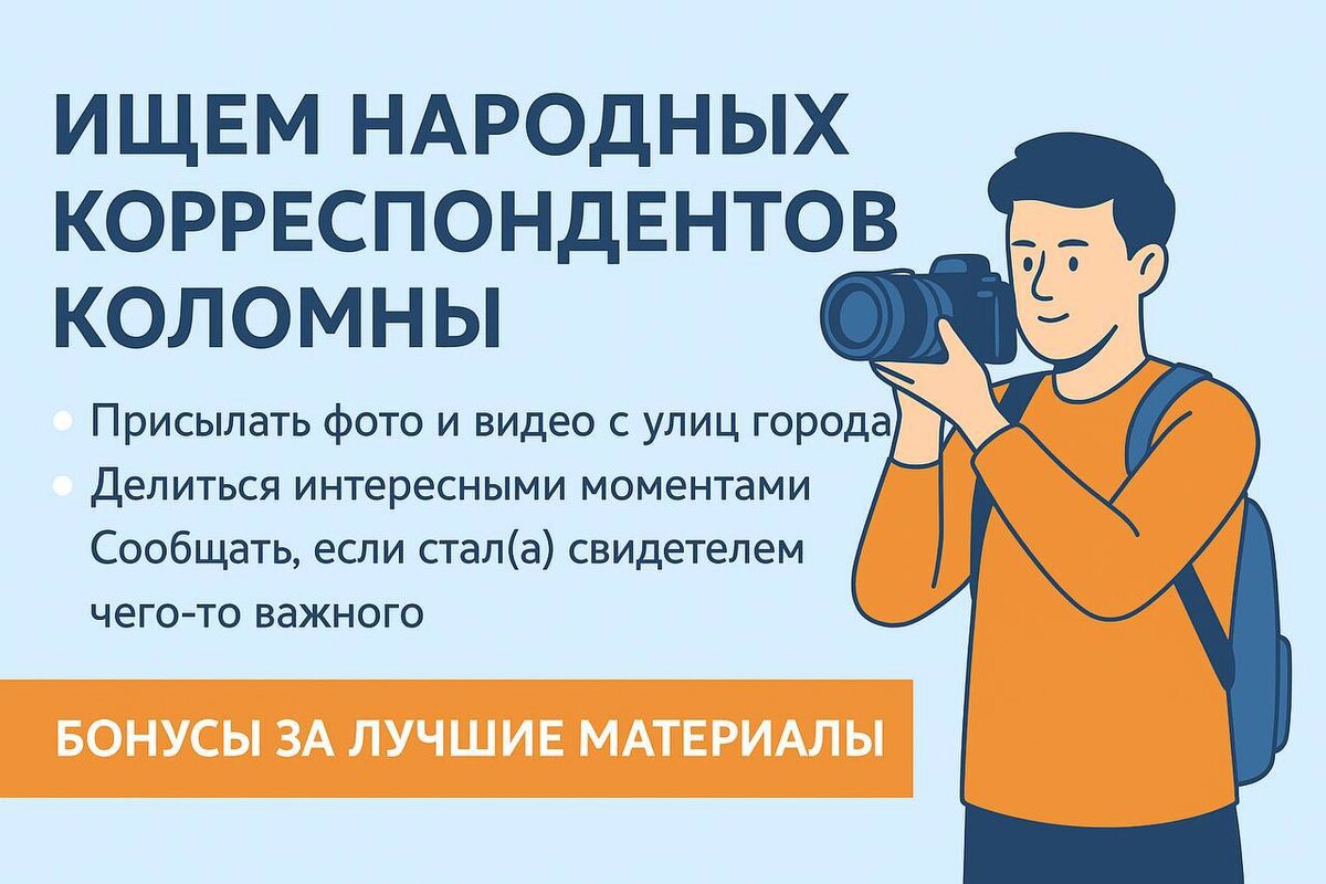 📢 Ищем народных корреспондентов Коломны! 📷🎥 Ты живёшь в Коломне, любишь снимать фото и видео, замечаешь интересное вокруг? Присоединяйся к нашему каналу в роли народного корреспондента от жителей! Что нужно делать: 🔹 Присылать фото и видео с улиц города — события, происшествия, атмосферные кадры 🔹 Делиться интересными моментами: концерты, забавные сцены, погода, благоустройство и т.д. 🔹 Сообщать, если стал(а) свидетелем чего-то важного 🎁 Бонусы за лучшие материалы, ваши кадры смогут попасть в наши посты 👍 ✉️ Прислать материал можно сюда 👉 @Maksim5889 Давайте вместе сделаем хронику Коломны живой и настоящей 💙❤️🤍 #Коломна #НародныйКорреспондент #фотоКоломна #видеоколомна