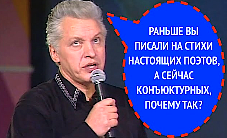 В своё время именно ваши песни познакомили нас с настоящей поэзией — Тряпкин, Рубцов. Но как же такие песни, как «Пташечка моя», «Мариночка Марина»? Это же откровенная конъюнктура. Почему вы их пишете? Это изменение вкусов, или поэтов нет, или вы изменились?