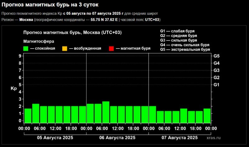 Три волны геовозмущений ожидаются в Белгородской области в августе По прогнозу Института космических исследований, умеренные геомагнитные возмущения пройдут 4-5 и 16-17 августа, а слабая буря ожидается 25 августа. Начало месяца уже ознаменовалось мощными солнечными вспышками — 3 августа была зафиксирована вспышка уровня M2.9, а 4 августа последовала вторая вспышка класса M2.1. Специалисты отмечают, что с 7 августа и до конца месяца сохранится фоновая геомагнитная активность, вызванная продолжающимися вспышками на Солнце. Метеозависимым людям в периоды бурь рекомендуется внимательнее следить за своим здоровьем, избегать переутомления и стрессовых ситуаций. Подписаться на 🗞🗞 | Поддержать бустом