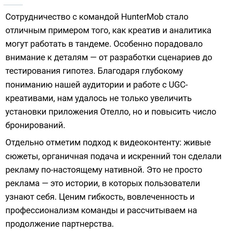 Какие креативы работают лучше: опыт продвижения Отелло (сервис поиска и бронирования проживания по всему миру от 2ГИС) с помощью UGC-видео. Креоформанс-агентство HunterMob 10 лет привлекает трафик в мобильные приложения бизнеса. Команда рассказывает, как создали креативы, которые привели новых пользователей и увеличили число броней.