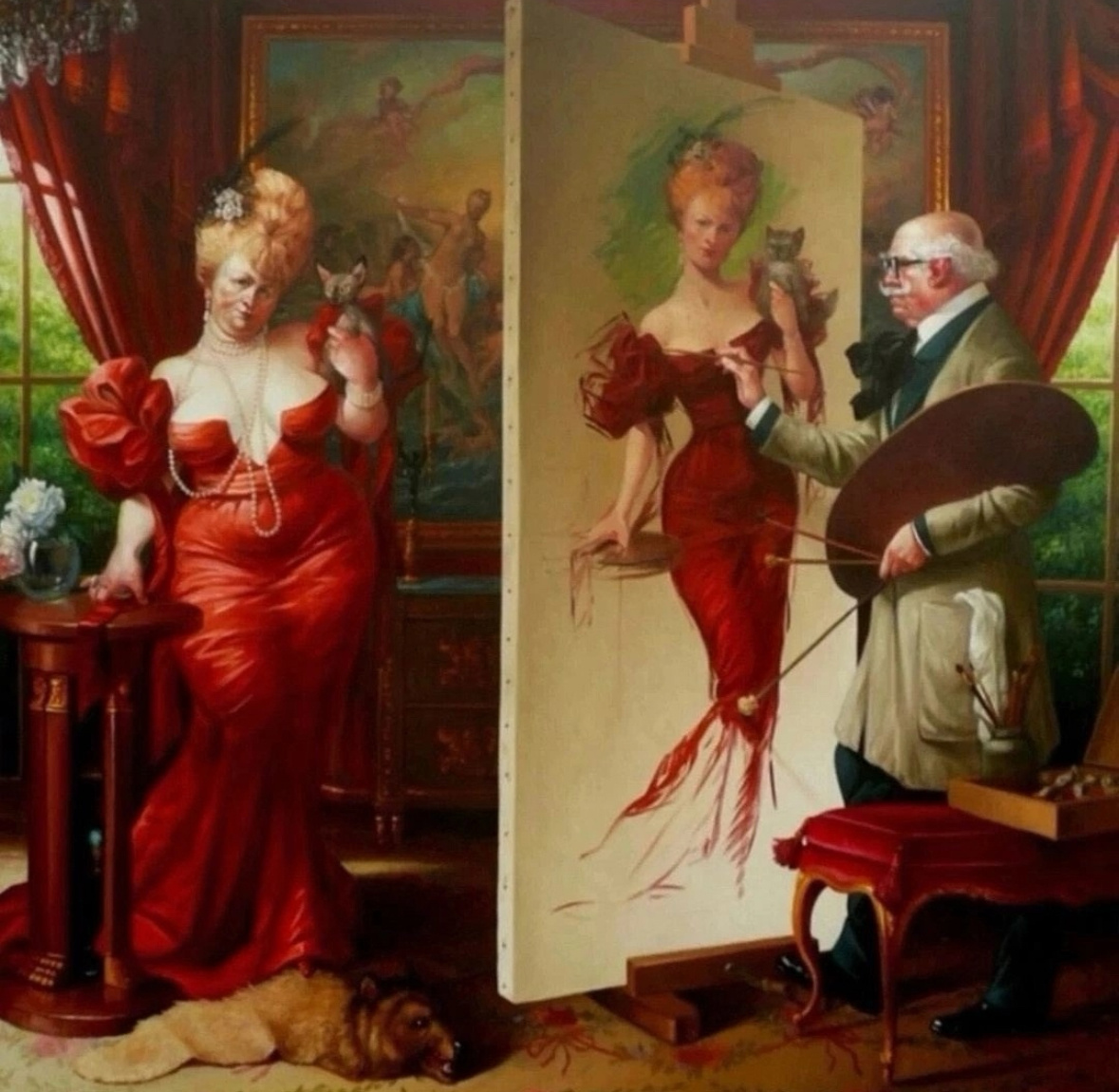 Зеркало иллюзий: о чём говорит эта картина? Художники веками создавали идеализированные образы, приукрашивая действительность. Однако Тьерри Брюэ в своей картине «Компромисс» обращается к острой социальной теме – стремлению людей скрывать правду под маской красоты. На полотне мы видим пожилую женщину в роскошном красном платье. Она стоит перед художником, позируя для портрета. Её лицо отражает прожитые годы, на теле заметны естественные изменения. Однако на холсте мастера перед нами предстаёт совершенно иной образ – молодая, утончённая, изящная дама, грациозно держащая маленького кота. Эта контрастность и является ключевым приёмом, через который Брюэ раскрывает смысл своего произведения. Картина словно разделена на две реальности. В одной – суровая правда, в другой – приукрашенный вымысел. Художник показывает зрителю, насколько легко человек идёт на компромисс с самим собой, выбирая приятную ложь вместо неудобной истины. Критика лицемерия и искусственной красоты Тьерри Брюэ известен