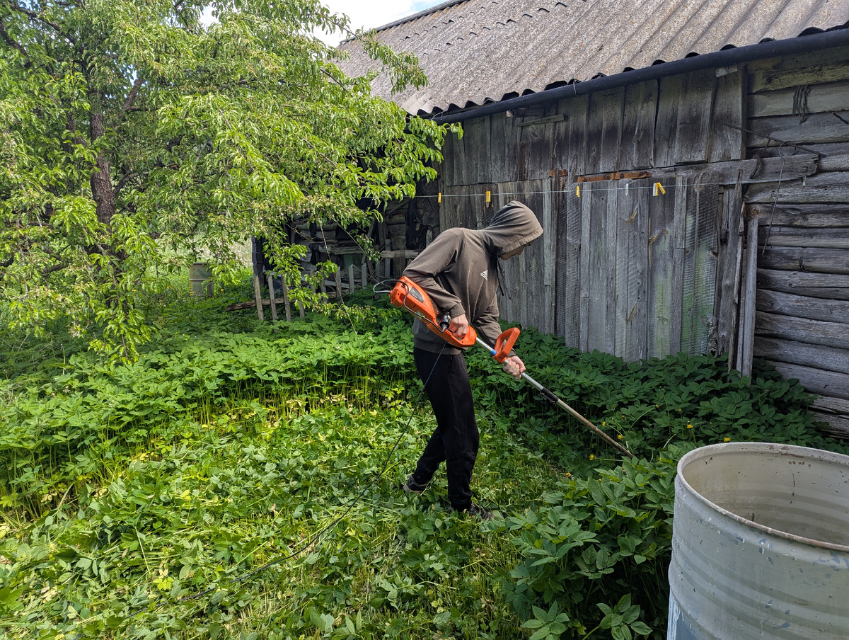 Это отдали Денису. К концу мая, тем более такого сырого, трава на участке, конечно, была выше крыши, поэтому оба дня Денис честно в поте лица выкашивал наросшие бурьян.