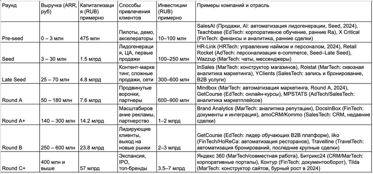 Таблица со сравнением ориентира по B2B SaaS-компаниям, работающим на русскоязычный рынок (2024–2025) В столбцах: стадия раунда, ориентир выручки, капитализации, способы привлечения клиентов, размер инвестиций и примеры актуальных компаний с коротким описанием (что делают и отрасль). Фокус — исключительно на русскоязычных и локальных игроках, лидерах и тех, кто недавно привлекал инвестиции или показывал бурный рост. Для инвесторов и менторов