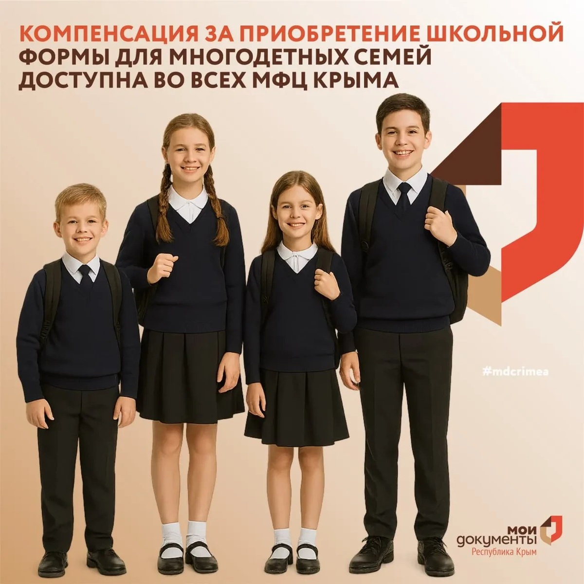 Многодетным семьям компенсируют затраты на приобретение школьной формы Компенсация за приобретение школьной формы для многодетных семей доступна во всех МФЦ Крыма, передает КерчьФМ. Перечень документов максимально упрощён. Об этом сообщает ведомство. Для получения услуги необходимы: паспорт, удостоверение многодетной семьи и реквизиты личного счета заявителя, открытого в кредитной организации. Заявление на денежную компенсацию за приобретение школьной формы многодетные семьи могут подать до 31 октября 2025 года включительно... подробнее Подписывайся на КерчьФМ.РФ @kerchfm