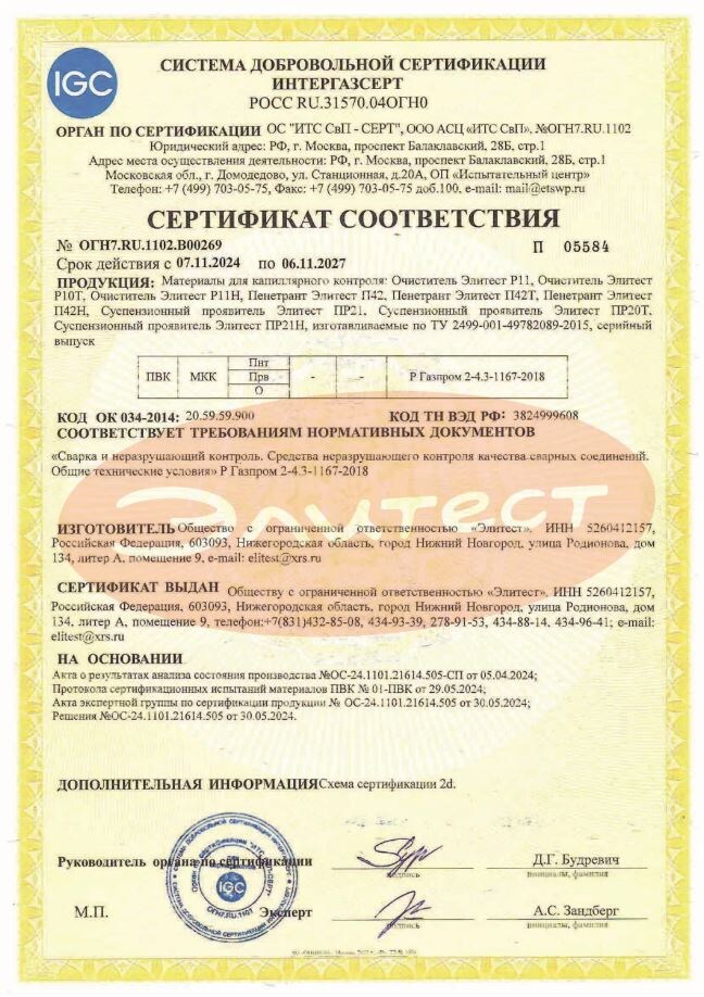 Сообщаем, что дефектоскопические материалы для капиллярного контроля Элитест прошли сертификацию в «ИнтерГазСерт» и рекомендованы к применению на предприятиях в структуре ПАО «Газпром».Основные расходные материалы для капиллярного контроля — очиститель, пенетрант, проявитель. В настоящее время рынок предлагает очень широкий выбор расходников: от разных производителей, под разные условия использования, разных уровней чувствительности и т. д.Очиститель для капиллярного контроляОчиститель — жидкость на основе органических растворителей или спирта. Используется для удаления загрязнений и обезжиривания поверхности контролируемого объекта. Затем с его помощью поверхность очищается от пенетранта, так, чтобы он остался только в порах и трещинах.Пенетрант для капиллярного контроляПенетрант — главный расходный материал ПВК. Это проникающая красящая жидкость, которая и позволяет выявлять дефекты. От проникающей способности пенетранта зависит чувствительность контроля, т. е. минимальный размер выя
