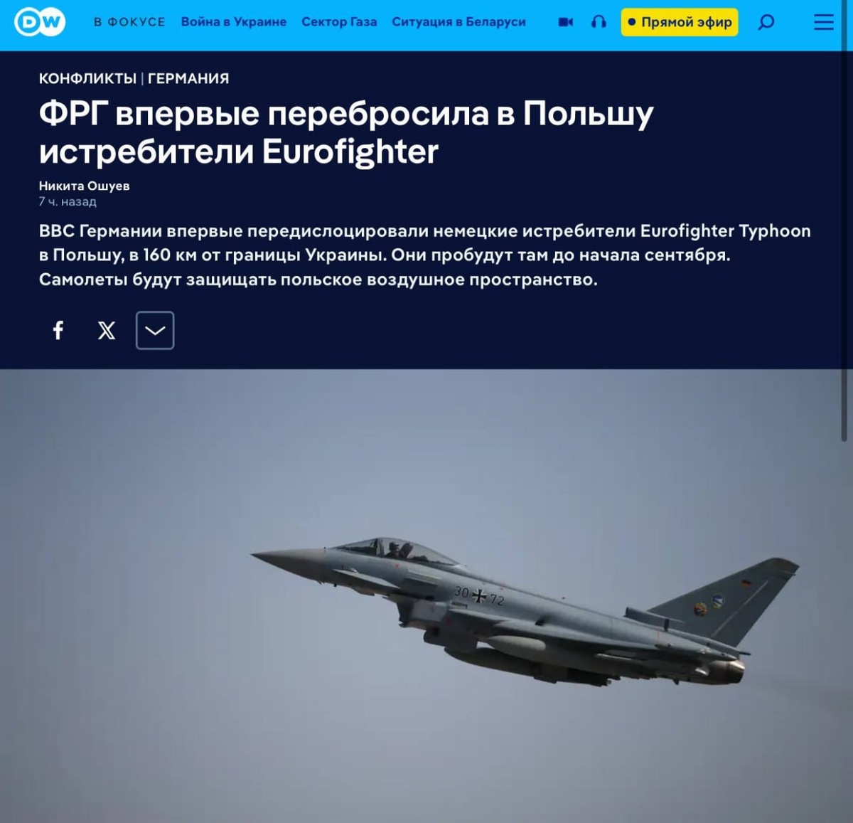 🇩🇪 Германия впервые передислоцировала в Польшу истребители Eurofighter Typhoon Пять немецких истребителей ✈️ приземлились на авиабазе Минск-Мазовецкий в Польше и будут помогать контролировать воздушное пространство НАТО, а также отслеживать потенциальную активность России на восточном фланге в течение следующих нескольких недель, начиная с 5 августа. Об этом сообщил спикер ВВС Германии. 🗣️ °Telegram • Zen • Bastyon° ✒️Предложить новость