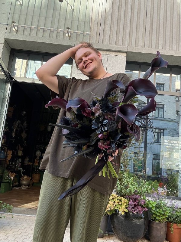 Что использовал: ▫️ Алоэ — мясистая зелень с «укусом». Сразу добавляет брутальности ▫️ Каллы — бархатно-чёрные, элегантные и мрачные ▫️ Эрингиум — фактура и «иголки», подчёркивающие остроту ▫️ Эхиверия — плотность и инопланетная красота ▫️ Хелеборус — драматичный и изящный, идеально для готического стиля ▫️ Пузыреплодник — фактурный, тёмный, словно дымка ▫️ Сухие одуванчики — неожиданный, хрупкий штрих. Напоминает, что в любом бунтарстве есть тонкость ▫️ Берграсс — даёт графику, завершает образ Техника: классическая спираль с акцентом на воздух и свободу каждому элементу. Это не просто букет — это портрет человека. И особенно приятно, когда такой портрет находит отклик. А если хочешь собирать такие же выразительные, глубокие букеты, в которых считываются характер и идея, приходи на мой онлайн-показ «Ничего обычного» 11 августа в 19:00 МСК Покажу, как с обычными материалами собирать необычные композиции, и создавать работы, которые запоминают и обсуждают 😏