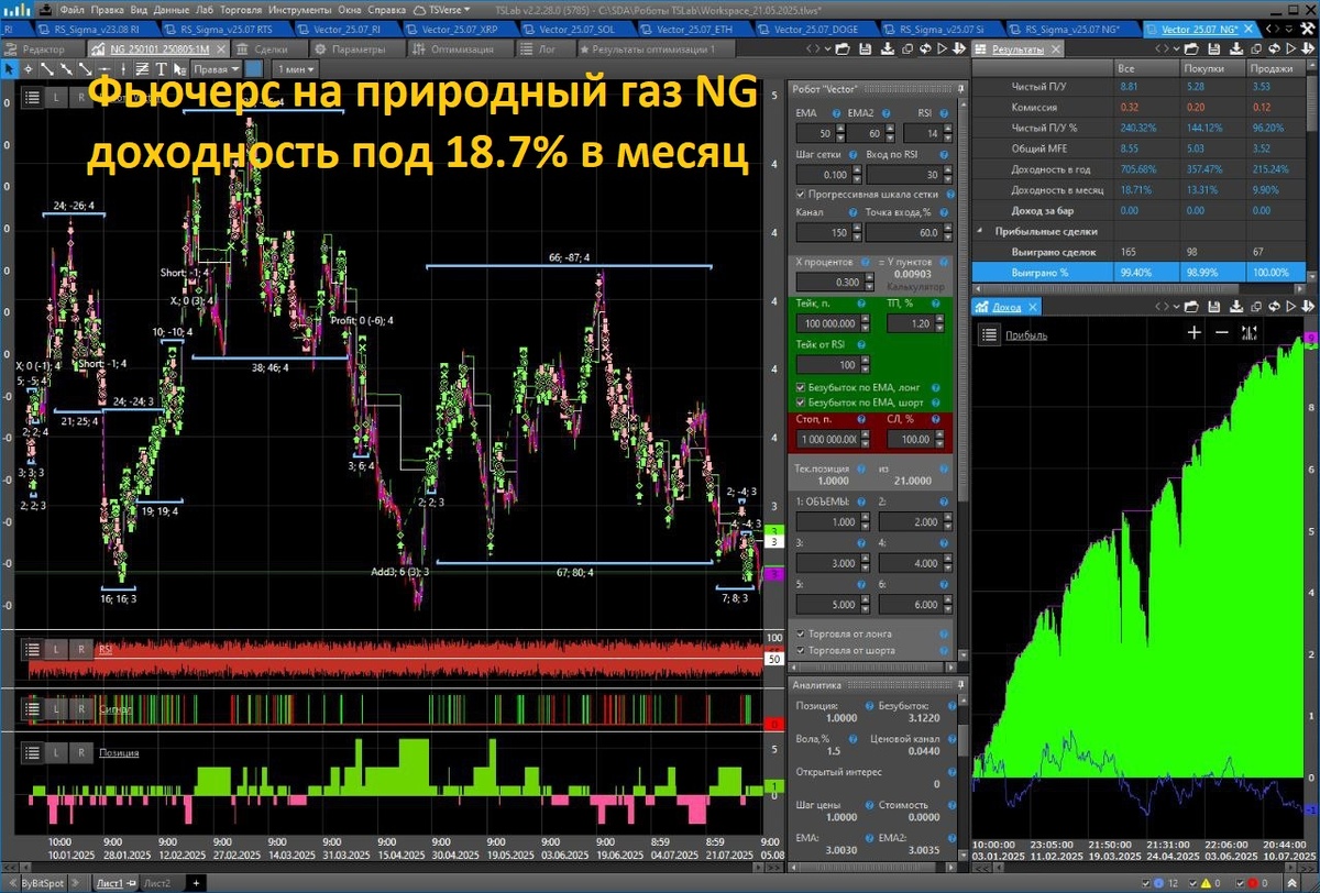 Робота Vector и фьючерс на Природный газ NG, за 2025 год, ТФ 1М. Торговля от лонга и от шорта.