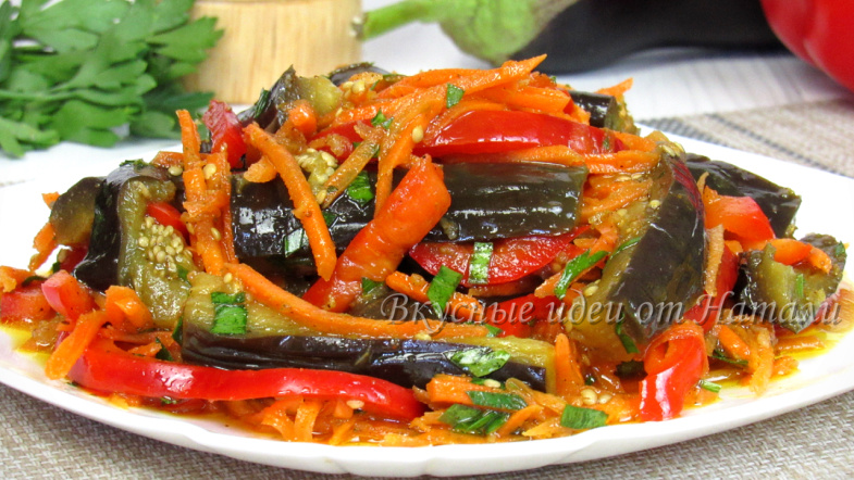 Иногда хочется сделать что-то вкусное, по-быстрому - без стояния у плиты и обжарки, без лишнего жира, запахов и разбрызганного масла. Особенно в жаркое время года. Вот тут и приходит на выручку один из моих любимых рецептов — баклажаны по-корейски. Это та самая закуска, которая готовится легко, без всякой возни, но при этом выходит настолько ароматной, сочной, вкусной, что ее запросто можно съесть всю до последней капли просто с кусочком хлеба. Много рецептов этой закуски пробовала, но именно этот простой рецепт понравился больше всего. 👩🍳 КАК ГОТОВЛЮ ПОШАГОВО: Баклажаны мою и отвариваю их до полуготовности. Опускаю их в кипящую подсоленную воду и варю около 10 минут под крышкой на среднем огне. Если баклажаны крупные — варю их чуть дольше 15–20 минут. Также, если баклажаны крупные, то делаю несколько проколов в них деревянной штажкой. Затем выкладываю баклажаны на доску, застеленную бумажным полотенцем. Сверху кладу ещё одну доску и придавливаю грузом — миской с водой. Оставляю на