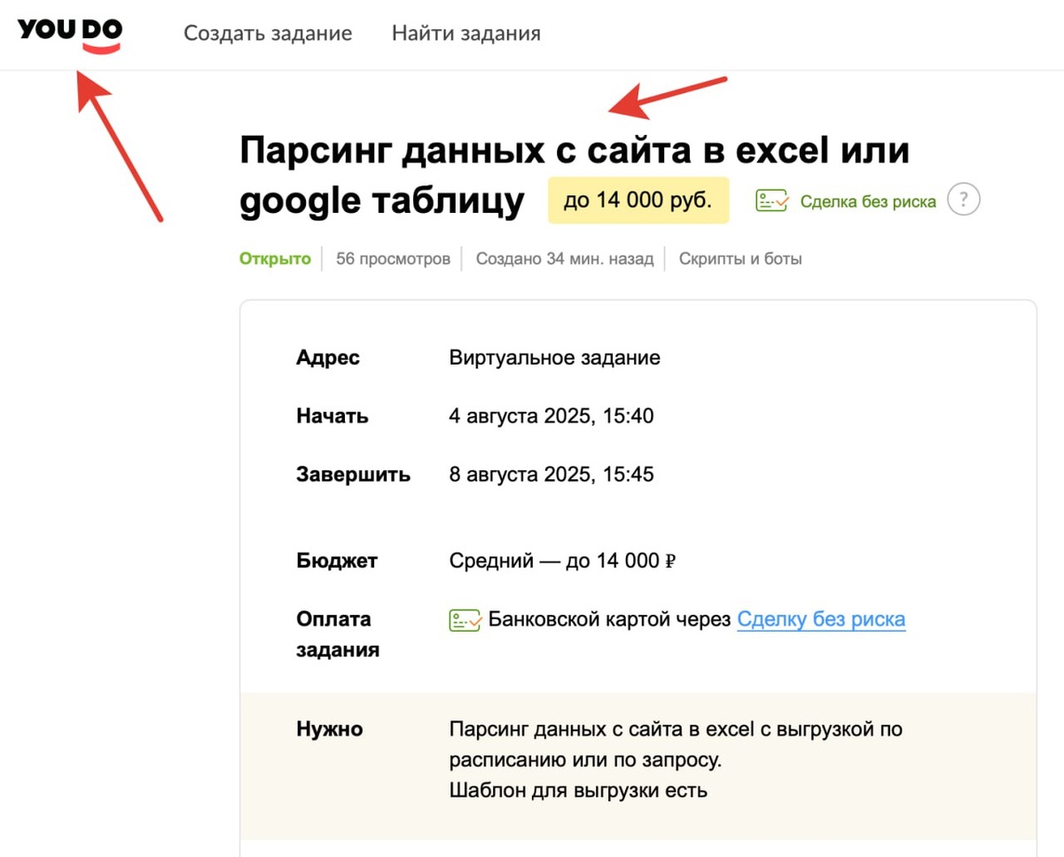 Мне в личку прислали - а вы знали, что лиды можно ловить на YouDo в ИТ сфере? Ну вот, например, ищут подрядчика на парсинг... Никогда бы не подумал. Сижу и чешу бестолковку - как на это откликаться юр.лицу :)