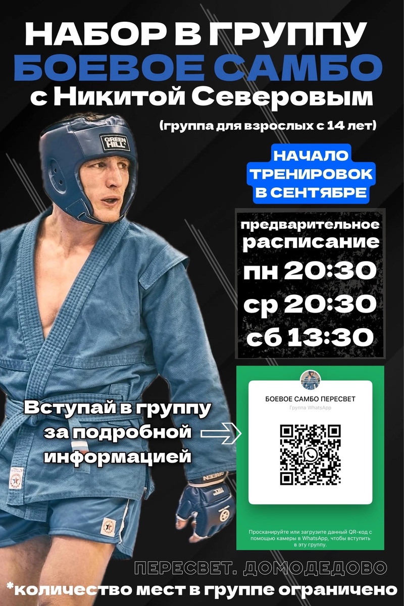 ✨ Новости! Идет набор в группу Боевое Самбо для взрослых.( От 14 лет ) Тренер МСМК - Никита Северов -Методист и автор собственных курсов обучения единоборствам (стаж более 17 лет). Педагог-психолог - Профессиональный боец ММА (смешанные единоборства) - Обладатель Кубка Мира по боевому самбо - Финалист Кубка Мира по спортивному самбо - Неоднократный победитель и призер чемпионатов и кубков России по боевому самбо и спортивному самбо - Многократный чемпион Москвы по самбо - Чемпион Санкт-Петербурга по боевому самбо - Призер чемпионатов Санкт-Петербурга по панкратиону - Призер чемпионата Москвы по дзюдо - Чемпион Чемпионатов Москвы и всероссийских турниров по грэпплингу и бразильскому джиу-джицу - Победитель профессиональных турниров по тайскому боксу в Таиланде. Ждем всех, опытных и новичков. Север научит ! 💰 Вход свободный❗️ ✅ Мероприятия Домодедово https://dzen.ru/id/66f10385cc4c5a16f7b5fb02 http://vk.com/domodedovo_events http://dzen.ru/domodedovo_events