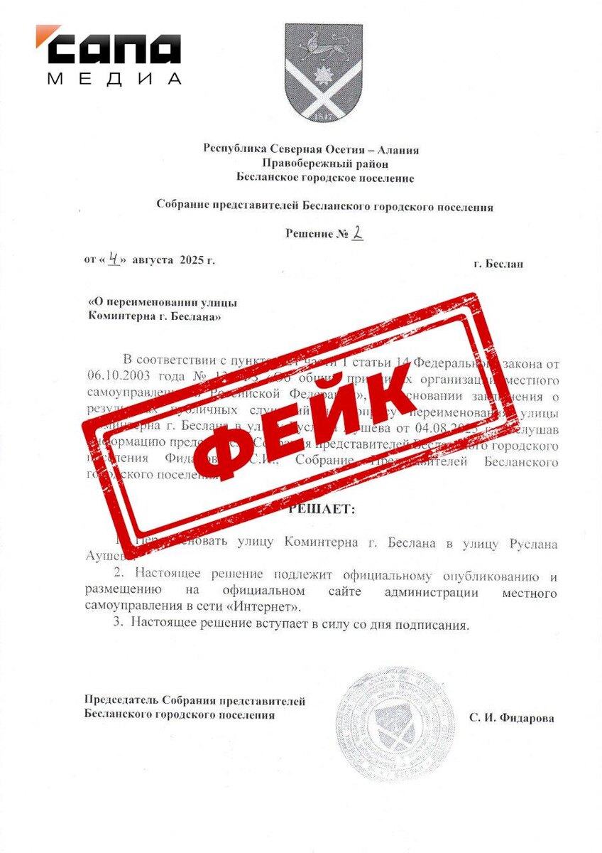 В соцсетях и мессенджерах распространяется очередной фейк, направленный разжигание межнациональной розни и повышения напряжения в осетинском обществе. Речь идет об информации о готовящемся переименовании улицы Коминтерна в Беслане в честь бывшего президента Ингушетии Руслана Аушева — форсируется скрин документа за подписью председателя собрания представителей Бесланского сельского поселения. В качестве основания для такого переименования ссылаются на роль Аушева в освобождении заложников во время трагедии 2004 года в Беслане. Как сообщает @sapa_15, в администрации Правобережного района опровергли наличие данного документа. В пресс-службе администрации муниципального района подчеркнули, что такой инициативы в органах местного самоуправления не выдвигалось.