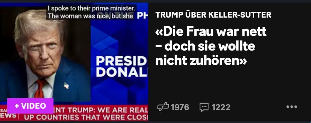 📌 " Трамп о разговоре с Карин Келлер-Саттер Во вторник в интервью каналу cnbc президент Сша Дональд Трамп сказал: "недавно у меня были дела со швейцарией. Я разговаривал с их премьер-министром, женщина была милой, но она не слушала меня - а я ее даже не знал". Он также рассказал ей, что США имеют дефицит в 41 миллиард долларов со Швейцарией. "И вы хотите платить однопроцентные тарифы? Я сказал ей, что они не будут платить только один процент". Изначально Швейцария и США заключили меморандум о взаимопонимании, в котором говорилось о 10-процентных тарифах. Речи об одном проценте, как утверждает Трамп в интервью, никогда не было " 💬 А говорят неповоротливые .. Во как .. Даже слово бедному вставить не дали ..