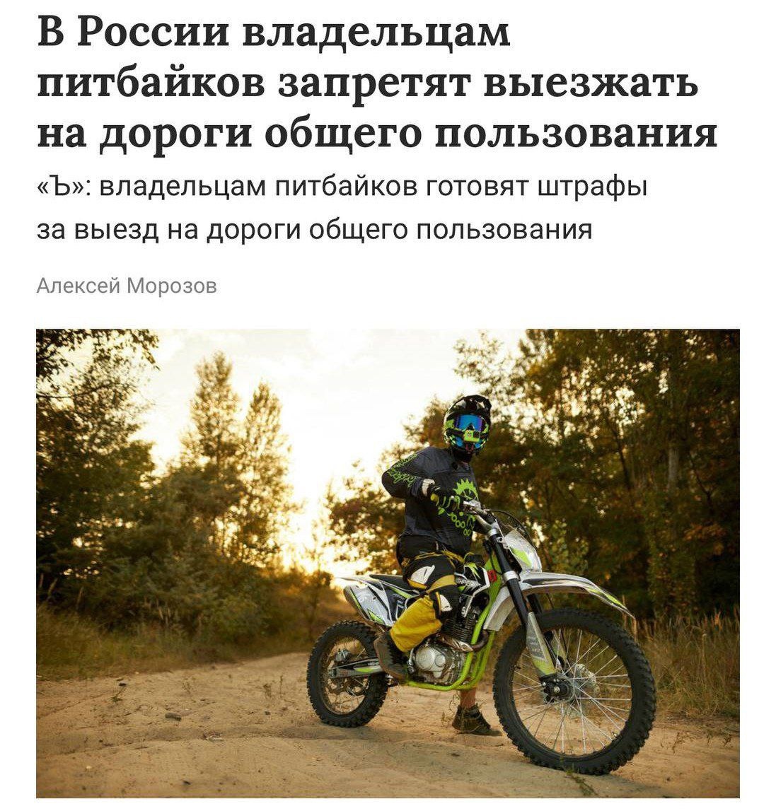 Владельцам питбайков планируют запретить выезжать на дороги общего пользования. За нарушение запрета в КоАП планируется прописать новый штраф до 30 тыс. рублей