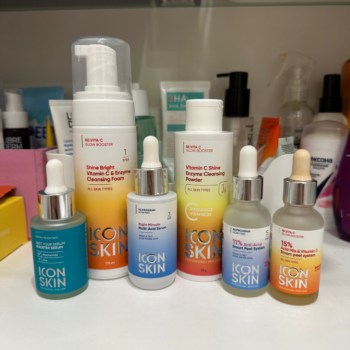 Хочу сегодня поделиться с вами полезным обзором на бренд Icon Skin, где можно встретить косметику действительно хорошего качества по адекватным ценам. Моя коллекция совсем не большая, но мне действительно есть что сказать. Начать хочу с себорегулирующей сыворотки-концентрат с Ниацинамидом и Цинком - Icon Skin reset your sedum booster serum. Совсем недавно писала про эту сыворотку обзор. Если кратко, то это действительно хорошая и рабочая сыворотка с высокой концентрацией ниацинамида. Основная задача этой сыворотки - это работа с выработкой себума и уменьшение воспалений. Однако помимо этого, она еще прекрасно работает с пигментацией и тусклым цветом кожи. Ее стоит использовать несколько раз в недель, либо через день, т.к. достаточно высокая концентрация ниацинамида в сыворотке может вызвать эффект чистки. Давайте поговорим об еще одной сыворотке - ночная мультикислотная сыворотка Icon Skin night miracle. Это сыворотка в состав, которой входит комплекс кислот (АНА, ВНА, РНА) для ре