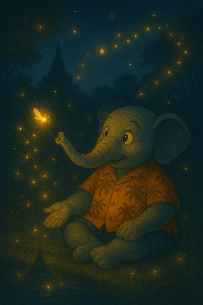 Говорят, в горах северного Таиланда, где скрыт древний храм Пхра Тхат, по ночам появляются особые светлячки. Но это не простые огоньки — это души тех, кто в жизни творил добро. Когда наш Слонёнок гулял по холмам, он набрёл на затерянную тропинку. Вдруг перед ним вспыхнул мягкий свет — целое облако светлячков, вырисовывающее в воздухе очертания старого буддийского храма. Не испугавшись, Слонёнок подошёл ближе, и один из огоньков тихо коснулся его хобота. Он услышал шёпот: «Если ты будешь добр — всегда найдёшь путь даже в самой густой темноте». Наутро тропа исчезла, но в памяти остался свет. И с той ночи, каждый раз, когда Слонёнок делает доброе дело, один огонёк возвращается к нему — чтобы осветить путь дальше.
