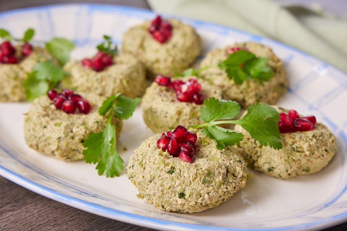 6. Охлаждённую массу скатайте в небольшие шарики, сделайте углубление в каждом, выложите на тарелку и украсьте зёрнами граната.