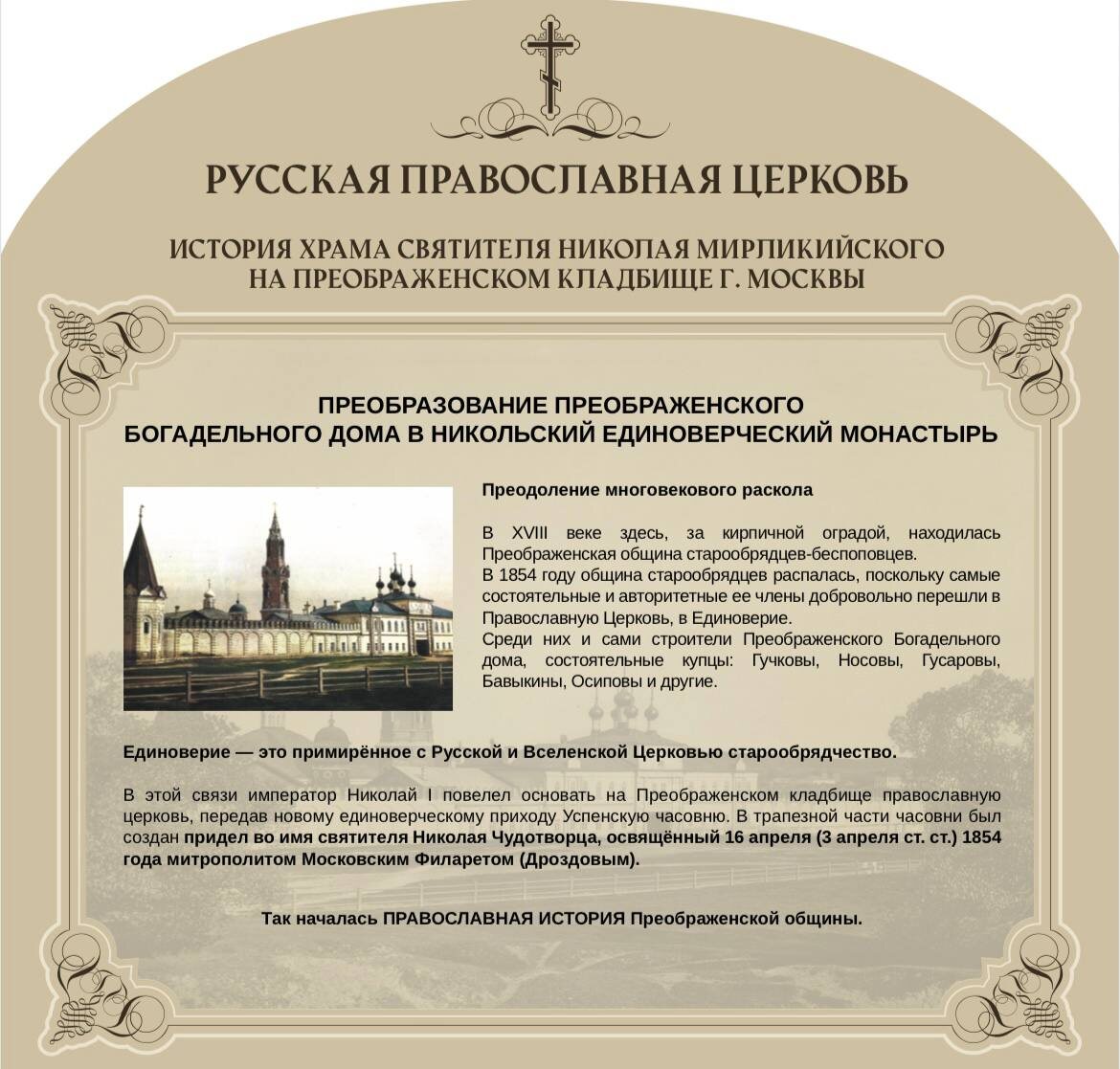 РУССКАЯ ПРАВОСЛАВНАЯ ЦЕРКОВЬ ИСТОРИЯ ХРАМА СВЯТИТЕЛЯ НИКОЛАЯ МИРЛИКИЙСКОГО НА ПРЕОБРАЖЕНСКОМ КЛАДБИЩЕ Г. МОСКВЫ ПРЕОБРАЗОВАНИЕ ПРЕОБРАЖЕНСКОГО БОГАДЕЛЬНОГО ДОМА В НИКОЛЬСКИЙ ЕДИНОВЕРЧЕСКИЙ МОНАСТЫРЬ Преодоление многовекового раскола В XVIII веке здесь, за кирпичной оградой, находилась Преображенская община старообрядцев-беспоповцев. В 1854 году община старообрядцев распалась, поскольку самые состоятельные и авторитетные ее члены добровольно перешли в Православную Церковь, в Единоверие. Среди них и сами строители Преображенского Богадельного дома, состоятельные купцы: Гучковы, Носовы, Гусаровы, Бавыкины, Осиповы и другие. Единоверие — это примирённое с Русской и Вселенской Церковью старообрядчество. В этой связи император Николай I повелел основать на Преображенском кладбище православную церковь, передав новому единоверческому приходу Успенскую часовню. В трапезной части часовни был создан придел во имя святителя Николая Чудотворца, освящённый 16 апреля (3 апреля с