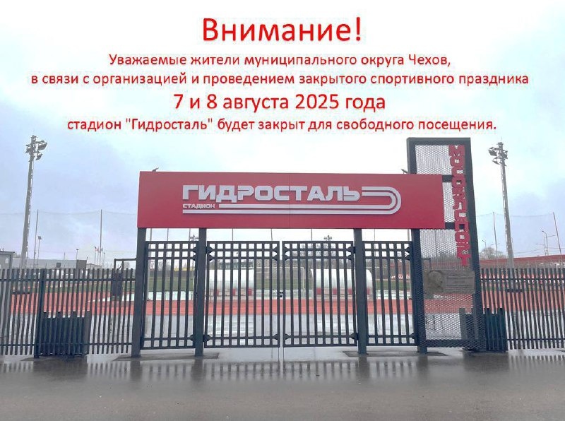 ✨ 🚫 ВАЖНАЯ ИНФОРМАЦИЯ! 🚫 Сообщаем вам, что стадион «Гидросталь» временно прекращает свободное посещение. Следите за нашими объявлениями — скоро вернемся к тренировкам и спортивному отдыху вместе! 👉 Прислать новость 💥 Проект "Чехов Детям"