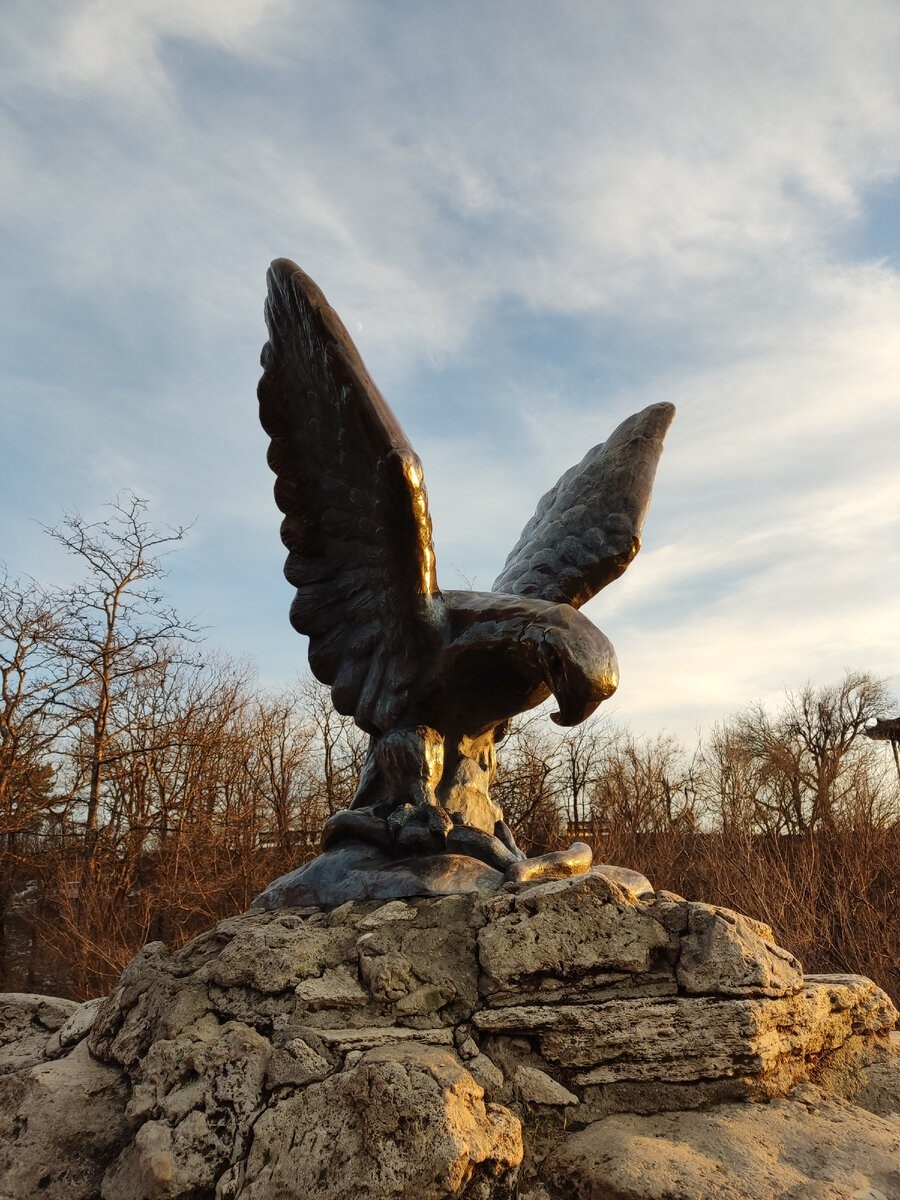 Орел, терзающий змею Кому не знакома скульптура орла, который терзает змею? Сейчас это изображение все чаще можно встретить на этикетках с минеральной водой, и многочисленных кондитерских изделиях Северного Кавказа. По легенде давным-давно вокруг горы Бештау (Ставропольский Край) места были дикими и пустынными. Только один орел, как царь птиц парил высоко в воздухе! Однажды, он решил ненадолго приземлиться на вершине горы Горячей и начал просто прохаживаться между камней. Прошло совсем немного времени, и орел обратил внимание на то, что в огромной куче камней притаилась ядовитая змея, которая за ним наблюдала все это время. Она напала слишком неожиданно и ужалила гордую птицу в грудь. Тогда орел сжал змею в своих цепких когтях, но силы покинули его и он упал прямо в горячий источник, который находился прямо под скалой. Волшебный источник вернул его к жизни. В 1901 году дирекция Кавказских Минеральных Вод расширяла и украшала Верхний парк в Пятигорске. Тогда художник Иван Крылов, обр