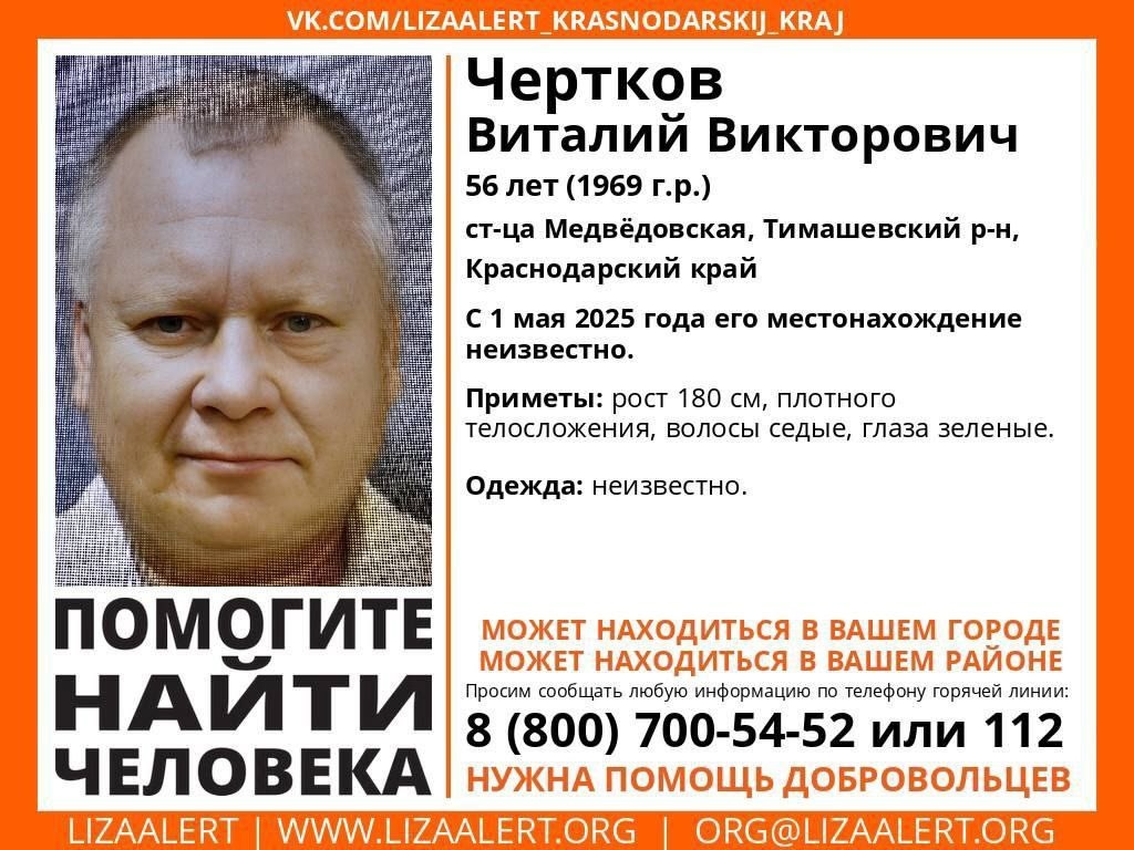 Пропал человек Разыскивается Чертков Виталий Викторович, 56 лет из станицы Медвёдовской Тимашевского района. С 1 мая 2025 года о его местонахождении ничего неизвестно. Приметы: - рост 180 см; - телосложение плотное; - волосы седые; - глаза зелёные; - во что был одет, неизвестно. Горячая линия отряда: 8 800 700 5452 – звонок бесплатный. 🚀 Подписаться | Прислать новость